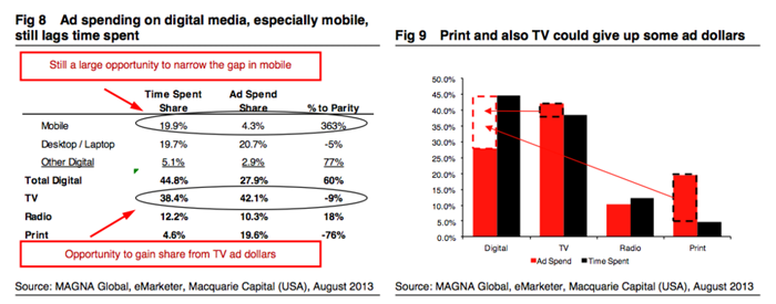 麥格理投資銀行(Macquarie Capital)的研究表明,消費者長時間呆的地方與廣告商投錢的地方嚴重錯位?,F在,人們花費在數字媒體上的時間多于電視;而廣告商投放在電視上的廣告費用卻要高于數字媒體。麥格理投資銀行稱,從長遠來說,這種錯誤最終會得到糾正,廣告費用會逐步轉移到數字媒體上。