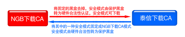 目前,泰信下載CA的接口規(guī)范已經(jīng)符合NGB下載CA,如果總局動員各種資源,強力推動符合NGB下載CA規(guī)范的芯片產(chǎn)業(yè)成熟,屆時,泰信下載CA將不作任何改動就可以完全滿足NGB下載CA的規(guī)范要求,這相當(dāng)于將泰信下載CA的一種安全模式固定為符合NGB的黑盒安全模式。NGB下載CA和泰信下載CA之間的關(guān)系如下: