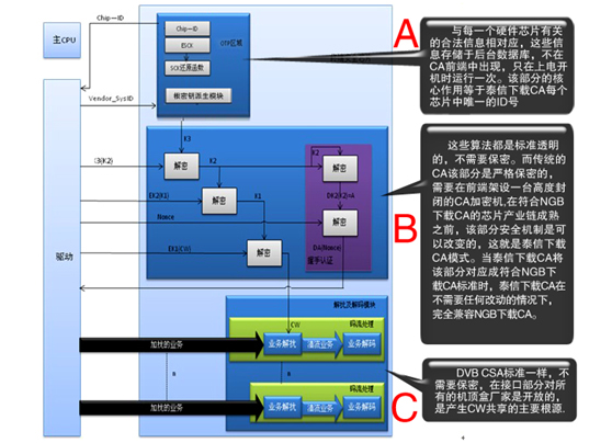 NGB下載CA的密鑰及派生算法均與加密機(jī)及前端CA服務(wù)器分離,即使有黑盒的NGB下載CA,黑盒保護(hù)的是與機(jī)頂盒有關(guān)的根密鑰,這個(gè)根密鑰與每一臺(tái)合法的芯片邦定,其作用與每一臺(tái)終端唯一的ID號(hào)等同,也與互聯(lián)網(wǎng)安全保護(hù)的CA證書作用類似,而用于CW加密的算法是標(biāo)準(zhǔn)和開(kāi)放的,這個(gè)算法在終端中的使用頻次很低。因此,不論NGB下載CA還是泰信下載 CA,都不需要再像以往的CA那樣在前端機(jī)房設(shè)置一個(gè)高度封閉的用于加密CW的加密機(jī),可以不需要在運(yùn)營(yíng)商前端下載CA服務(wù)器設(shè)置黑盒。
