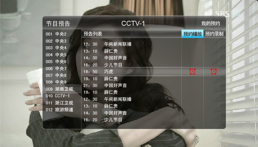 點擊遙控器上的“節目表”,然后會出現節目預告EPG信息,可選擇自己喜歡的節目進行預約播放或者預約錄制。若進行了預約播放,不論您處在哪個電視頻道,到達時間點都會提示您,是否播放,以免錯過喜愛的節目。預約錄制可以將喜歡的節目錄制下來,有時間再回看。此設計非常人性化,且很方便。