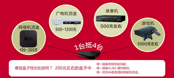 現(xiàn)在,有一款融合有線電視和網(wǎng)絡(luò)電視的機頂盒—泰信盒子,讓您由被動的看電視到主動的玩電視,變身電視的主人。泰信電子擁有二十年數(shù)字電視技術(shù)研發(fā)經(jīng)驗,借助自主研發(fā)的直播電視操作系統(tǒng)DTVOS,實現(xiàn)了有線電視、網(wǎng)絡(luò)電視、錄像機、游戲機等功能的融合,全國通用,開啟了第四代機頂盒的新時代,彌補了廣電有線電視機頂盒和網(wǎng)絡(luò)機頂盒無法兼容的缺陷,讓您不必因看不同內(nèi)容而頻繁切換盒子。其家庭共享功能可以讓您只交一份錢,多臺電視機免費看有線電視,絕對是省錢好幫手。