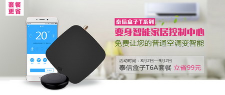 8月福利來了!泰信盒子為慶智能家居系列產品上線,讓大家提前嘗鮮,特推出優惠套餐活動:購泰信盒子,可免費將您家中普通空調變智能空調。您或許會問看電視跟空調有什么關系?一臺小小的機頂盒能改變空調的功能?