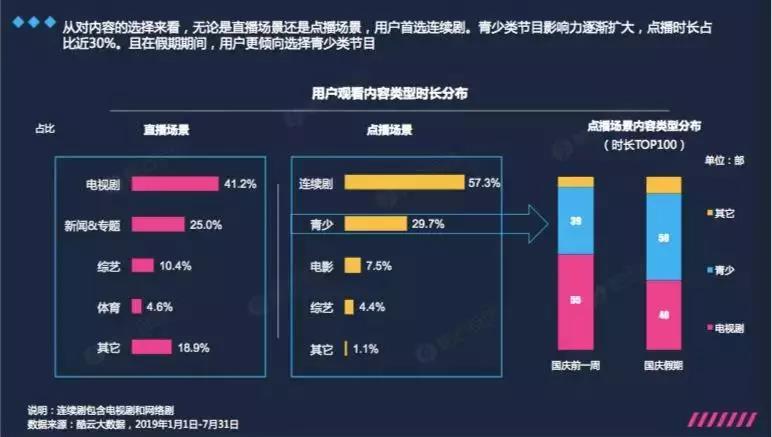 還記得每逢9月1日家里電視就被《開學第一課》支配的恐懼嗎?根據酷云EYE Grow數據顯示,2019年的《開學第一課》直播關注度達到了11.0389%,與2018年相比直播關注度增長了2.2080%。如此高關注度背后映射出的是,青少類節目已成為影視綜之外,最具增長實力的節目類型?!秷蟾妗凤@示,目前在點播場景下青少節目排名僅次連續劇,占比近30%,且假期期間用戶更傾向選擇青少類節目。究其原因,酷云互動認為,非假日期間家長為安撫年幼的孩童,更樂于點播青少類節目,以此使孩子安靜下來,降低其在家中的“破壞性”。假期期間,父母會將電視選擇權交給孩子,讓他們點播自己喜愛的青少類節目。因此,青少類節目正成為繼影視綜外,觀眾觀看需求增長迅速的節目類型。
