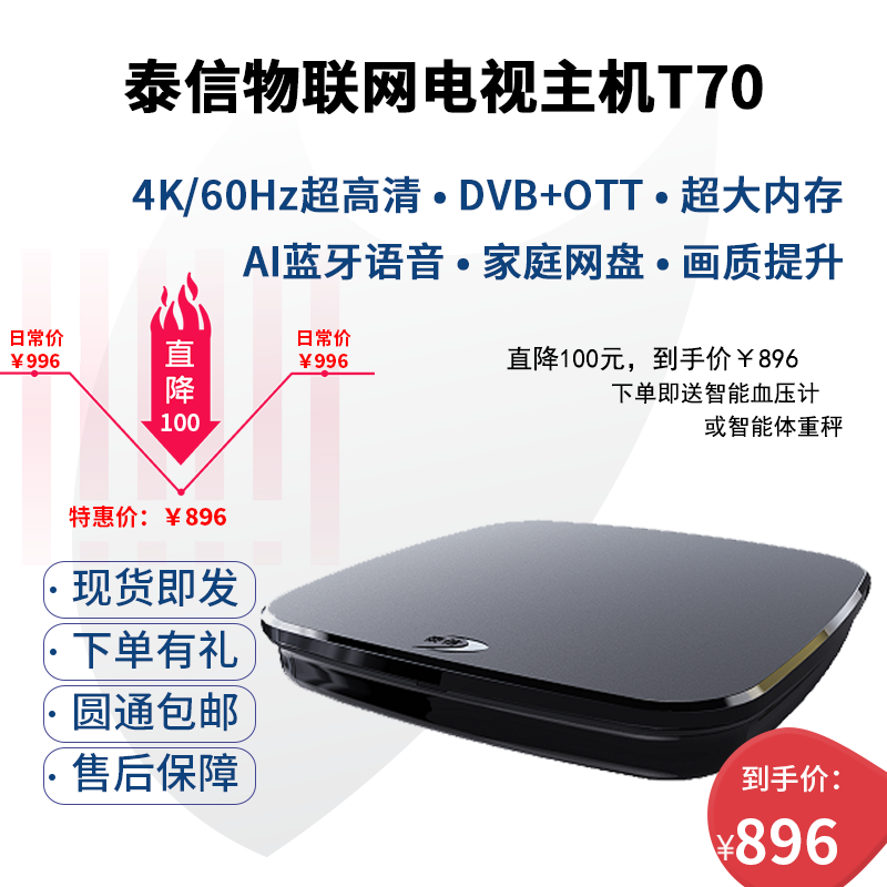 物聯網電視主機T70(不帶音箱) 【包郵】 直降100元,單拍T70到手價896元。送升級版藍牙語音遙控器和智能血壓計或智能體重秤