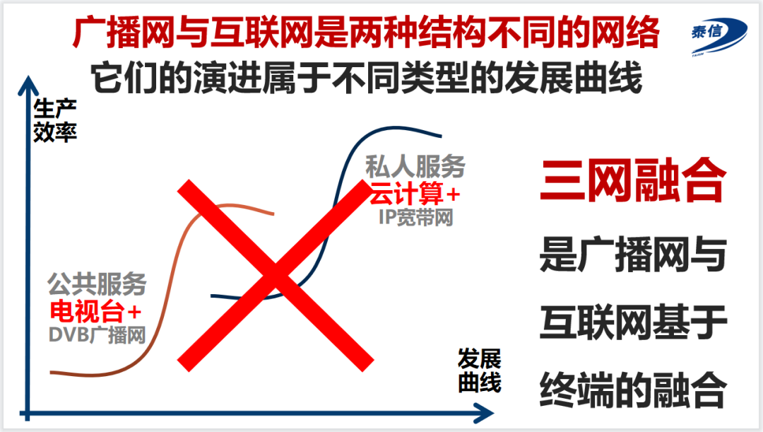 廣播網是以電視臺為中心的點對面的公共服務,互聯網則是以各種云計算為中心的點對點的私人服務,二者有各自的應用場景,在社會功能上各有不同,是兩種結構不同、有各自的優缺點、不能互相代替的網絡,不存在相互迭代關系,只能基于終端融合發展。