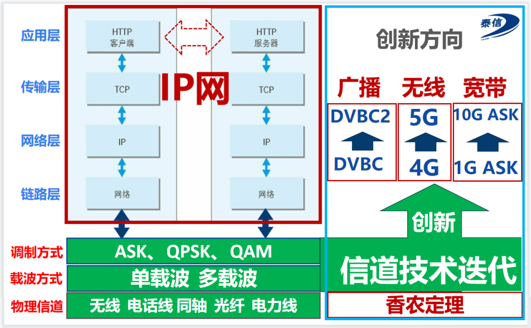 該圖中標識了IP協議在網絡中的位置,它位于基礎信道技術之上,是屏蔽了信道差異性、與信道無關的互聯網通信協議。綠色部分是網絡技術的創新方向。3-5G、WiFi、光纖通信等技術,都是在這個方向上進行創新,目的是盡量高效地利用物理信道。