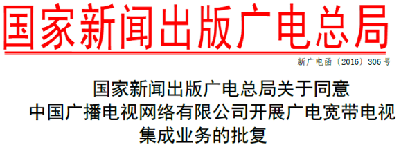 2016年,廣電總局給了中國廣電批復,同意后者建設和運營全國廣電寬帶電視集成平臺,面向經有線電視網接入互聯網的用戶開展寬帶電視集成業務。