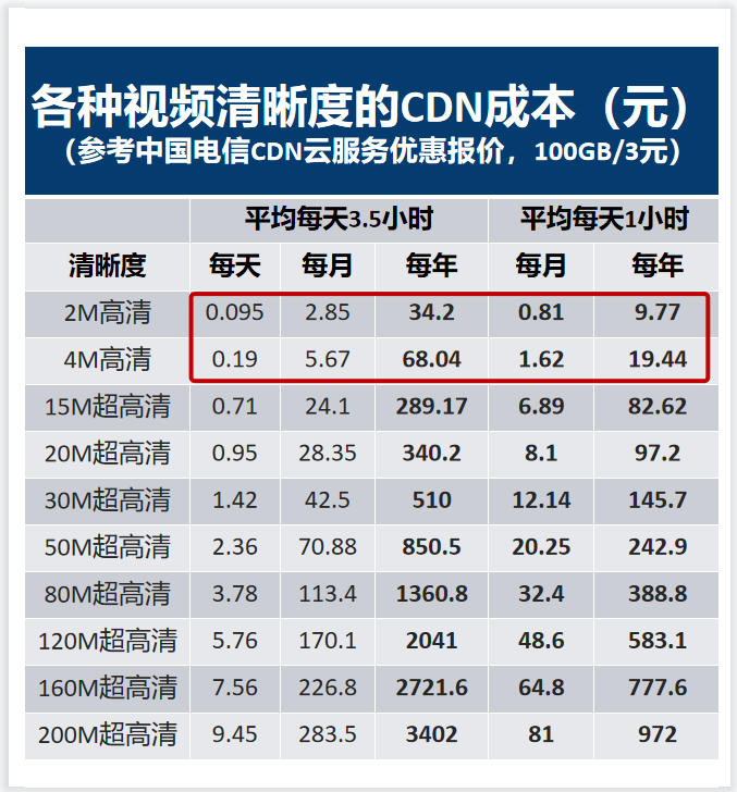 參考中國電信CDN優惠報價,當用戶收看4M碼流、H.265的高質量高清電視時,并假設平均每天看3.5小時,CDN加速服務成本每年約68元。